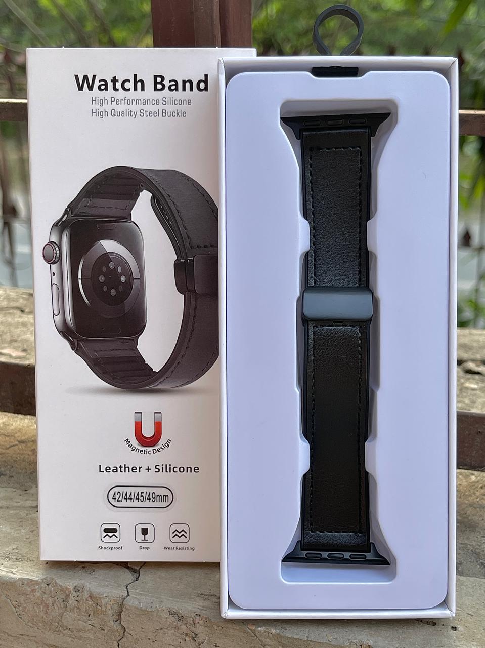 Material: Crafted from a combination of durable leather and flexible silicone, the band boasts a stainless steel buckle with a convenient magnetic closure.